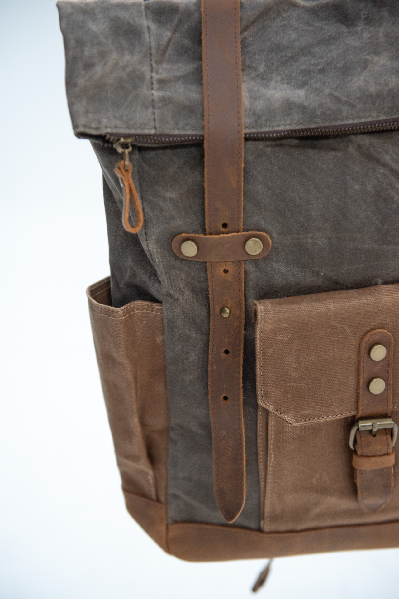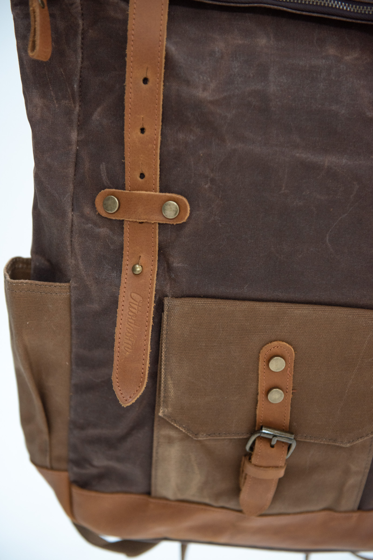 Rolltop backpack in coated canvas with leather details and engraved Ottodrom logo: functional and resistant design, ideal for everyday use and your travels. A perfect mix of style and practicality.
