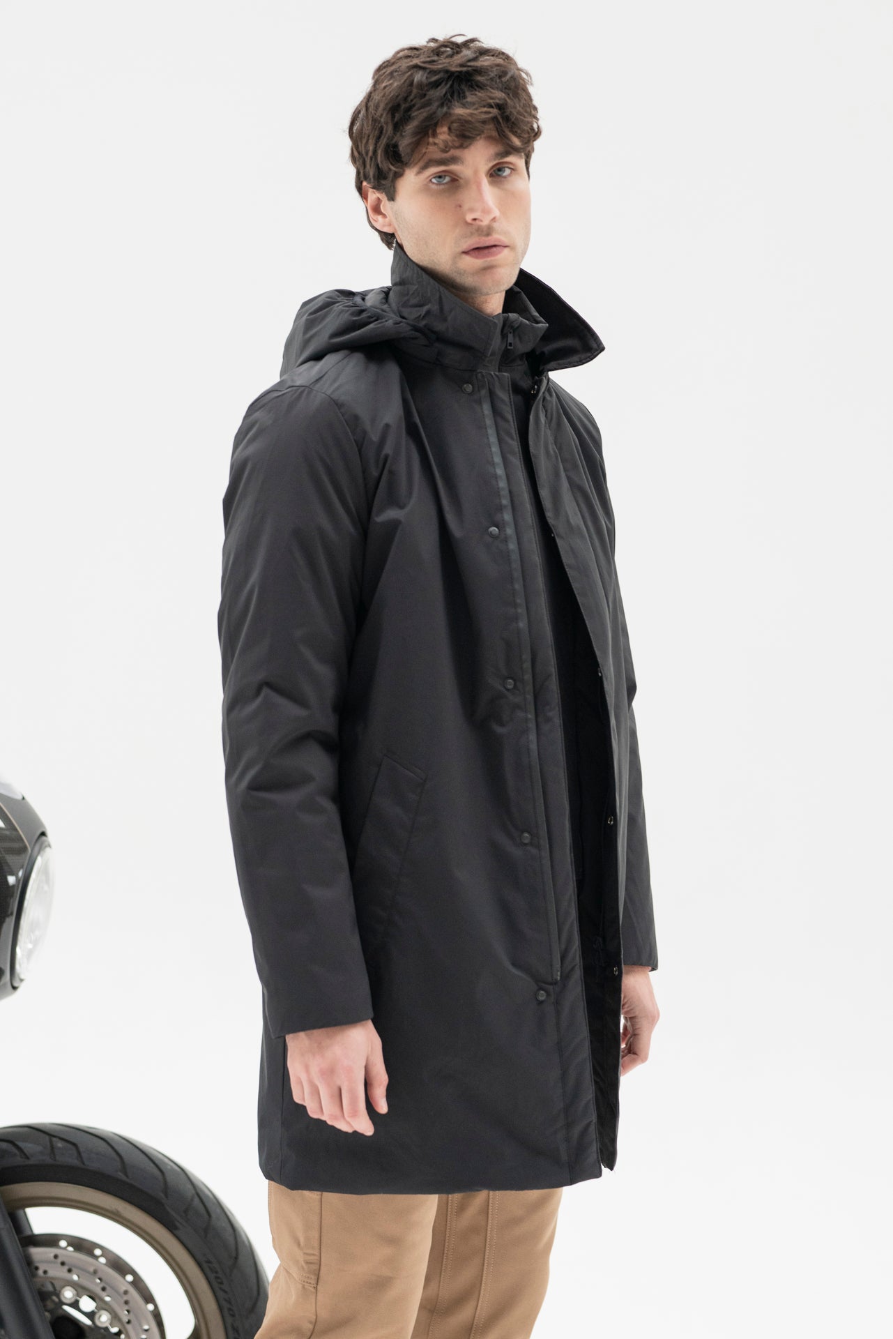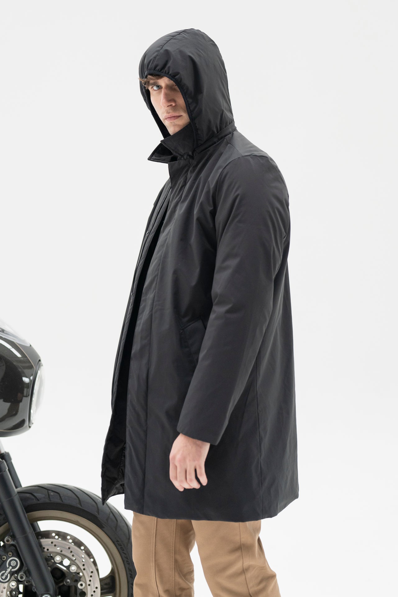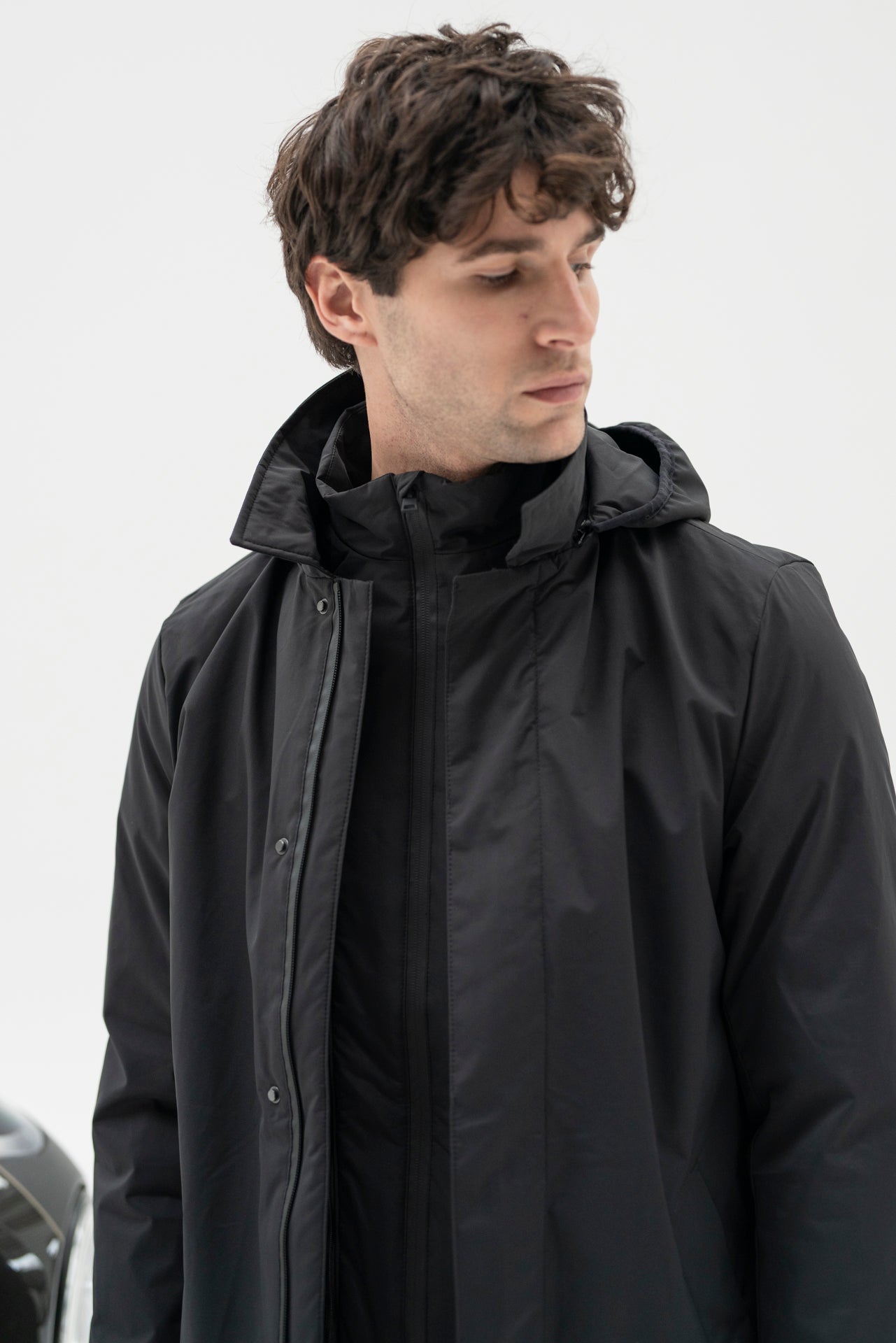 Raincoat with detachable hood and removable inner bib, body welt pocket, zip fastening and snap button placket: a waterproof and versatile garment, designed to protect you from the rain in style. Comfort and practicality in every detail.
