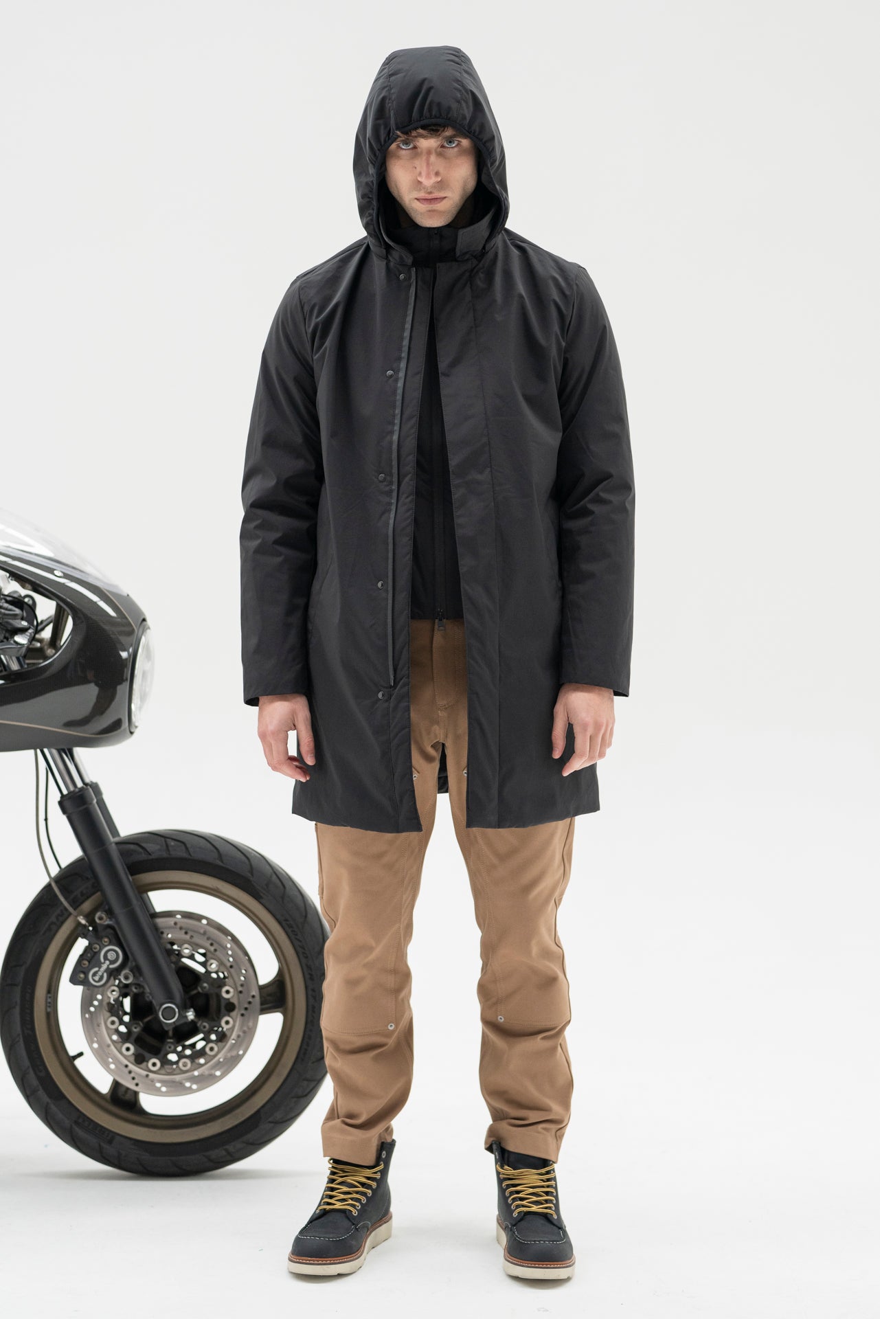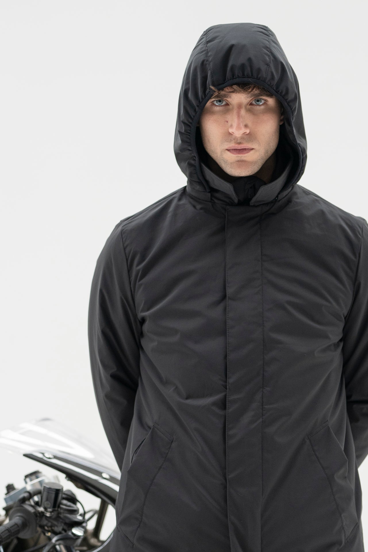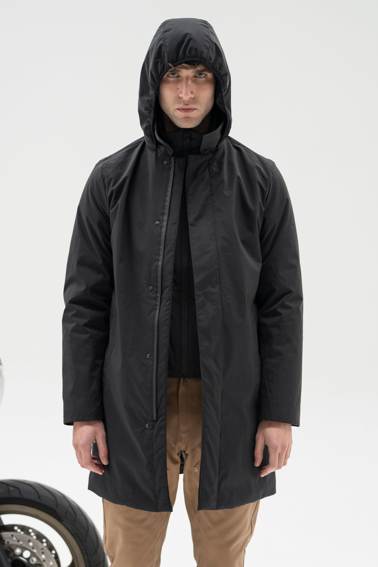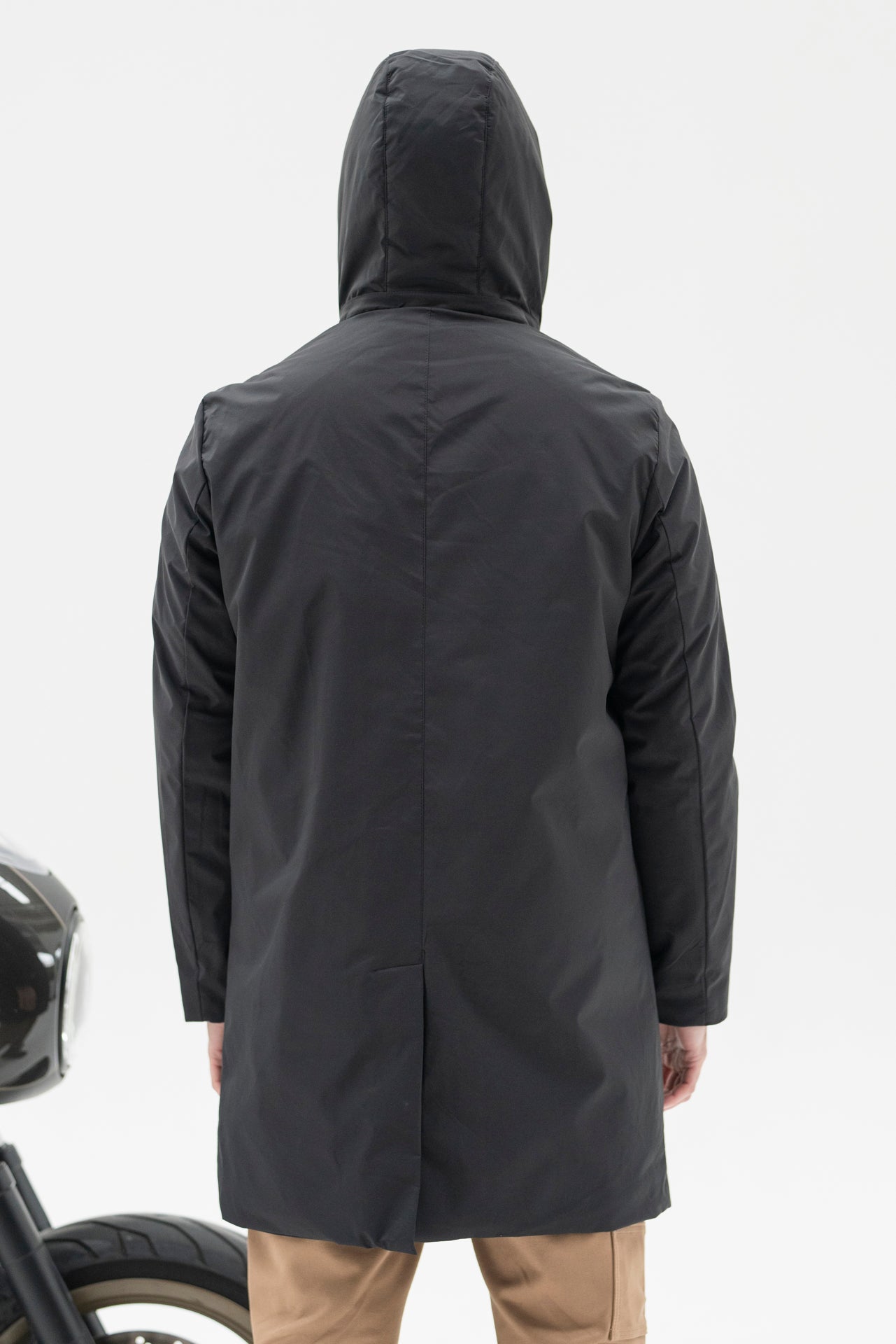 Raincoat with detachable hood and removable inner bib, body welt pocket, zip fastening and snap button placket: a waterproof and versatile garment, designed to protect you from the rain in style. Comfort and practicality in every detail.