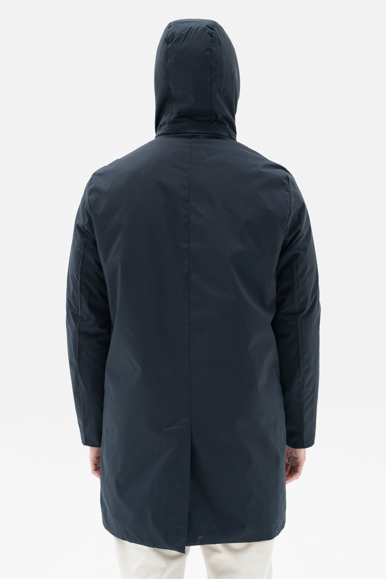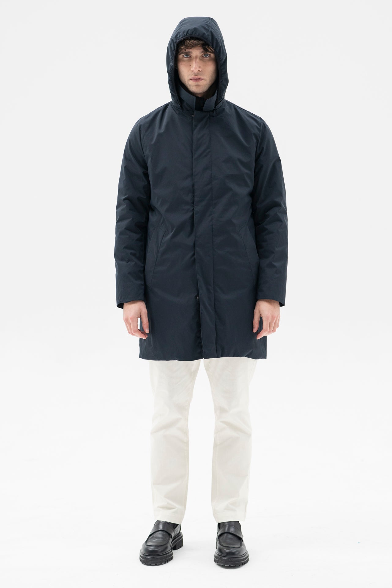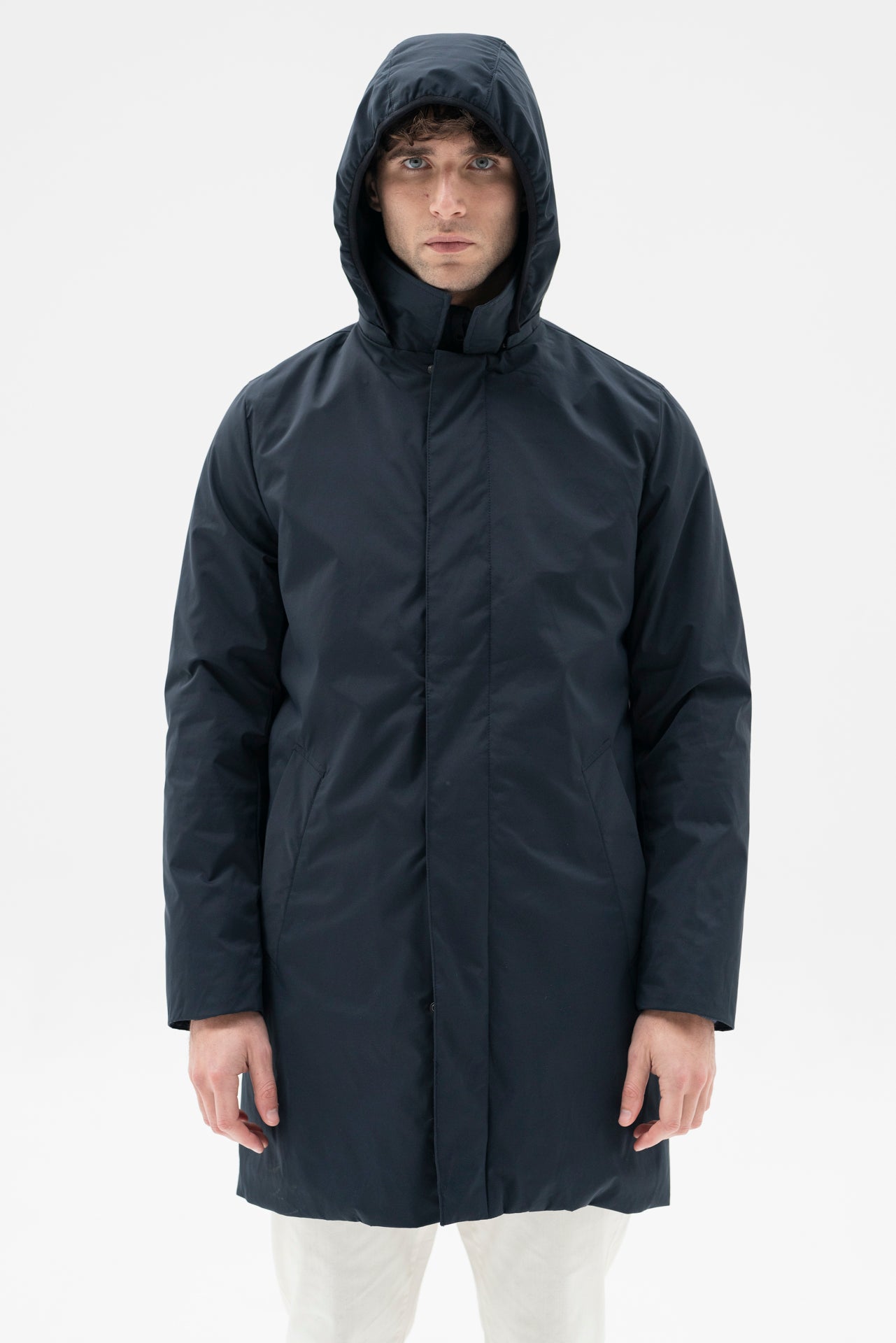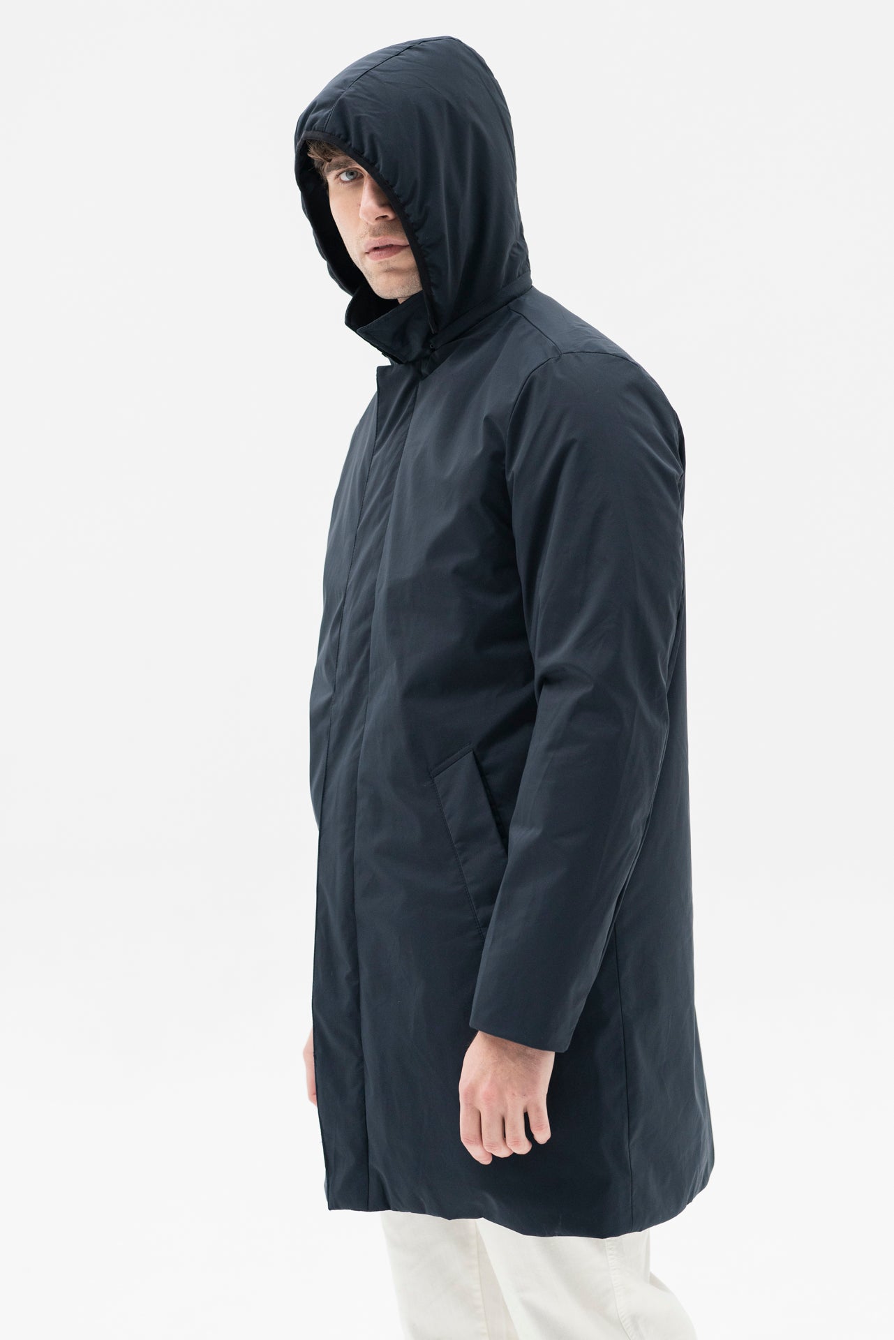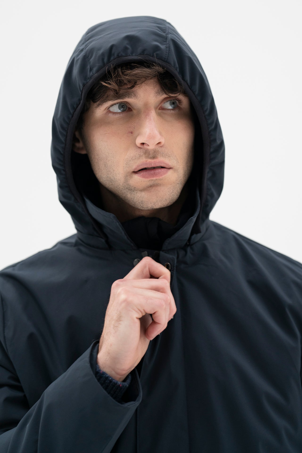 Raincoat with detachable hood and removable inner bib, body welt pocket, zip fastening and snap button placket: a waterproof and versatile garment, designed to protect you from the rain in style. Comfort and practicality in every detail.