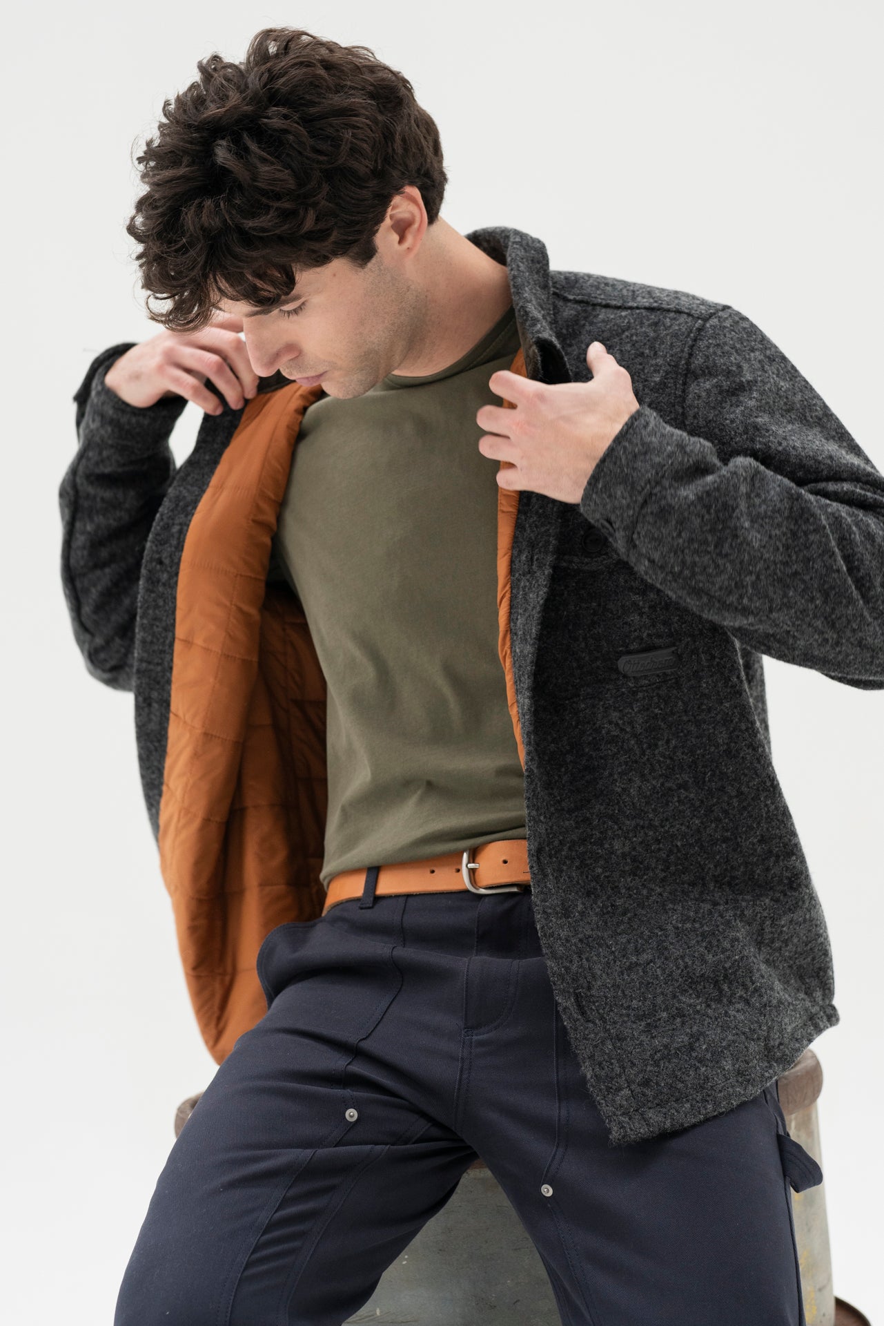 Cloth jacket with patch chest pockets with flap and button, contrasting color internal quilting: a versatile and warm garment, perfect for the mid-seasons. Style and comfort in a practical and fashionable design.