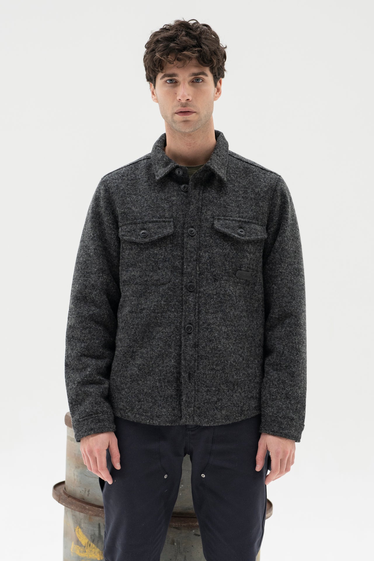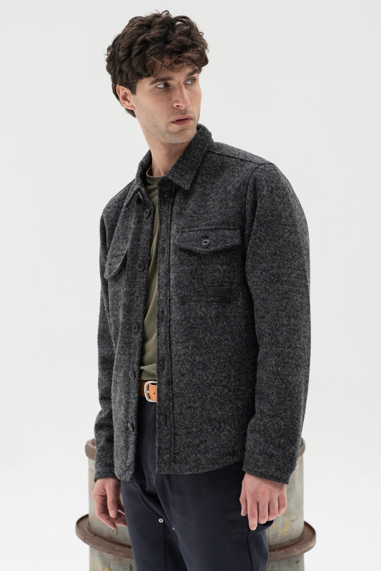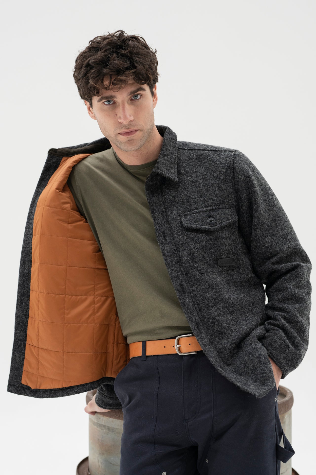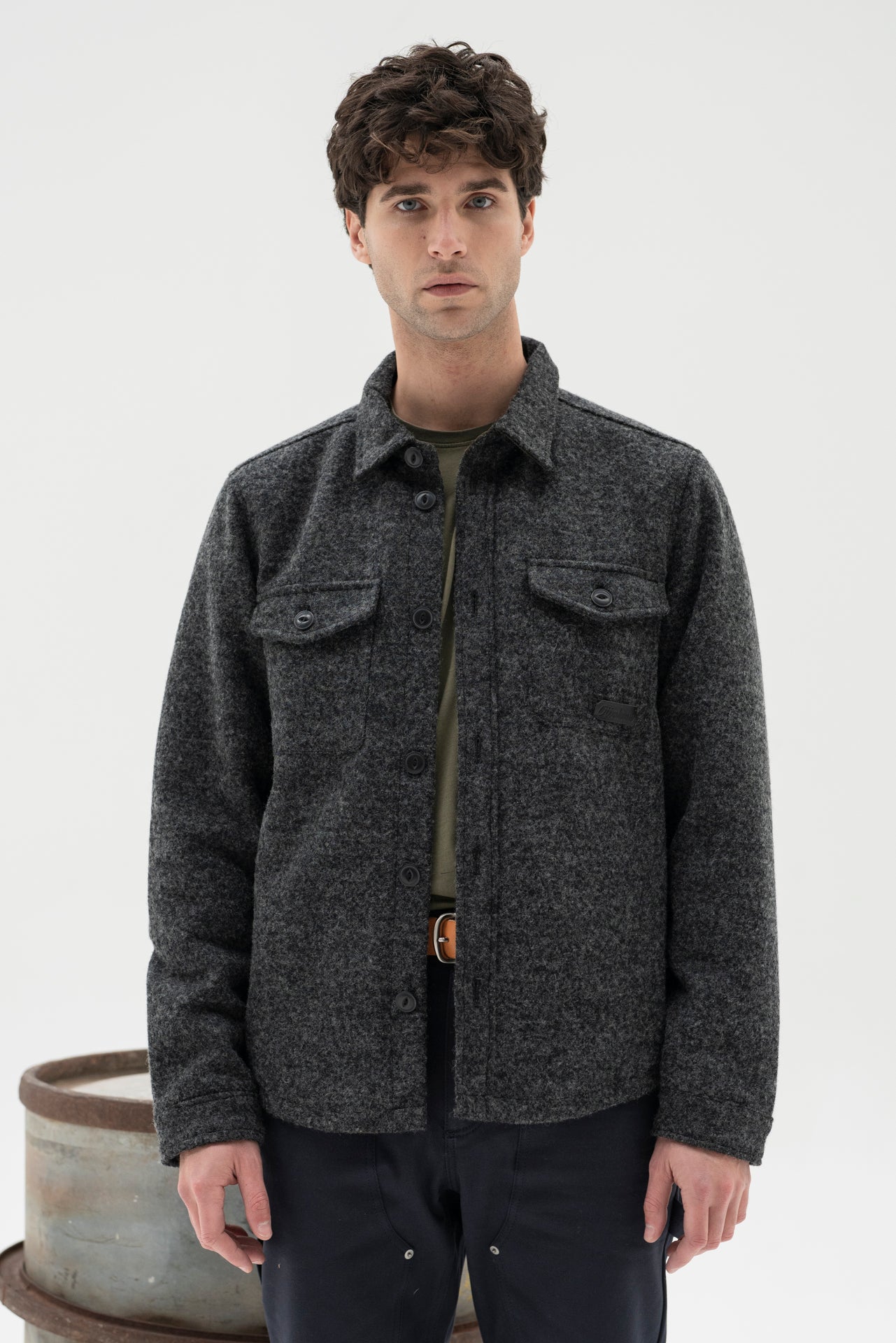 Cloth overshirt with patch chest pockets with flap and button. Contrasting color internal quilting.