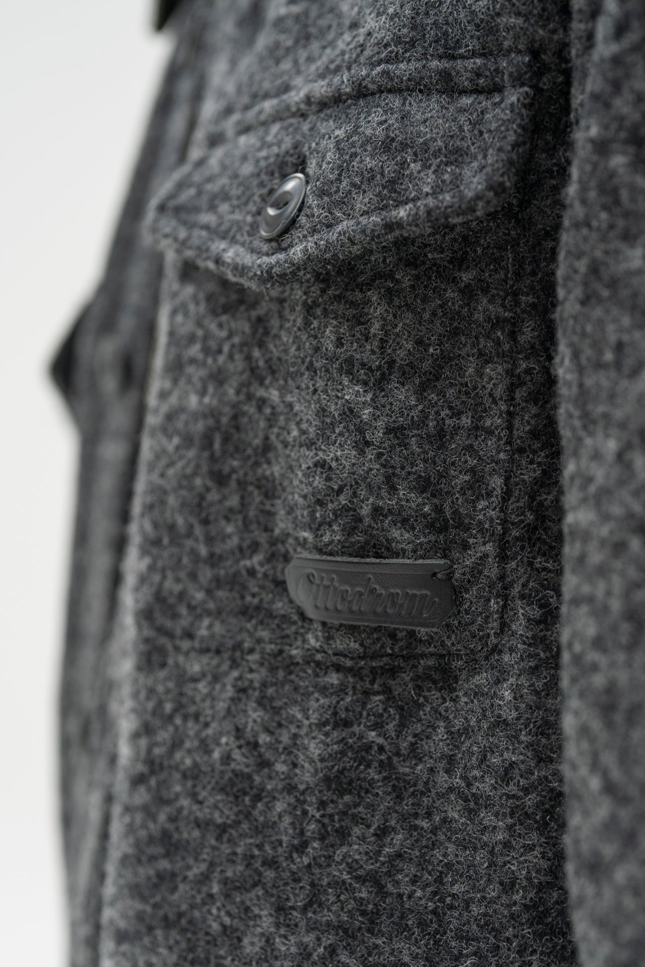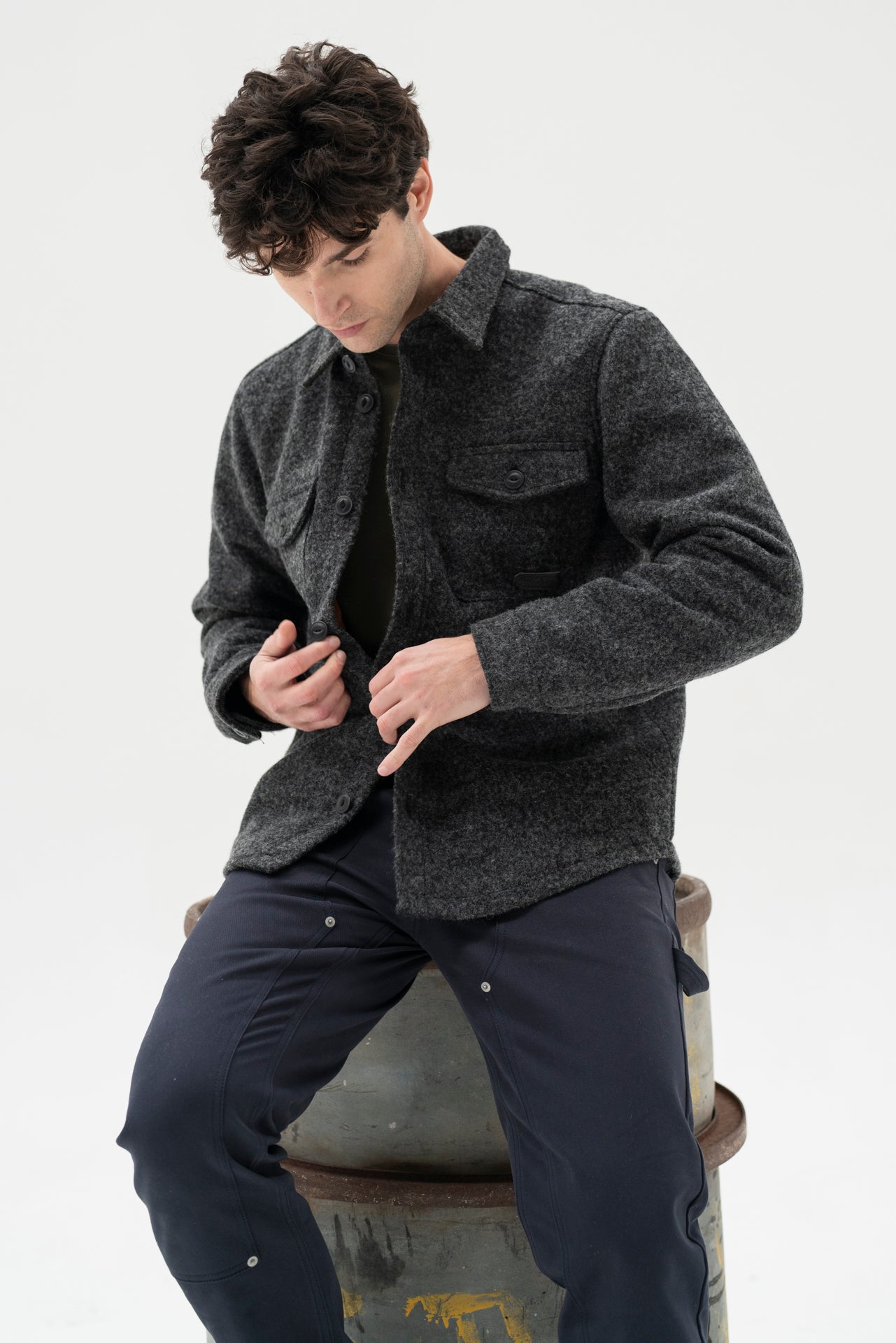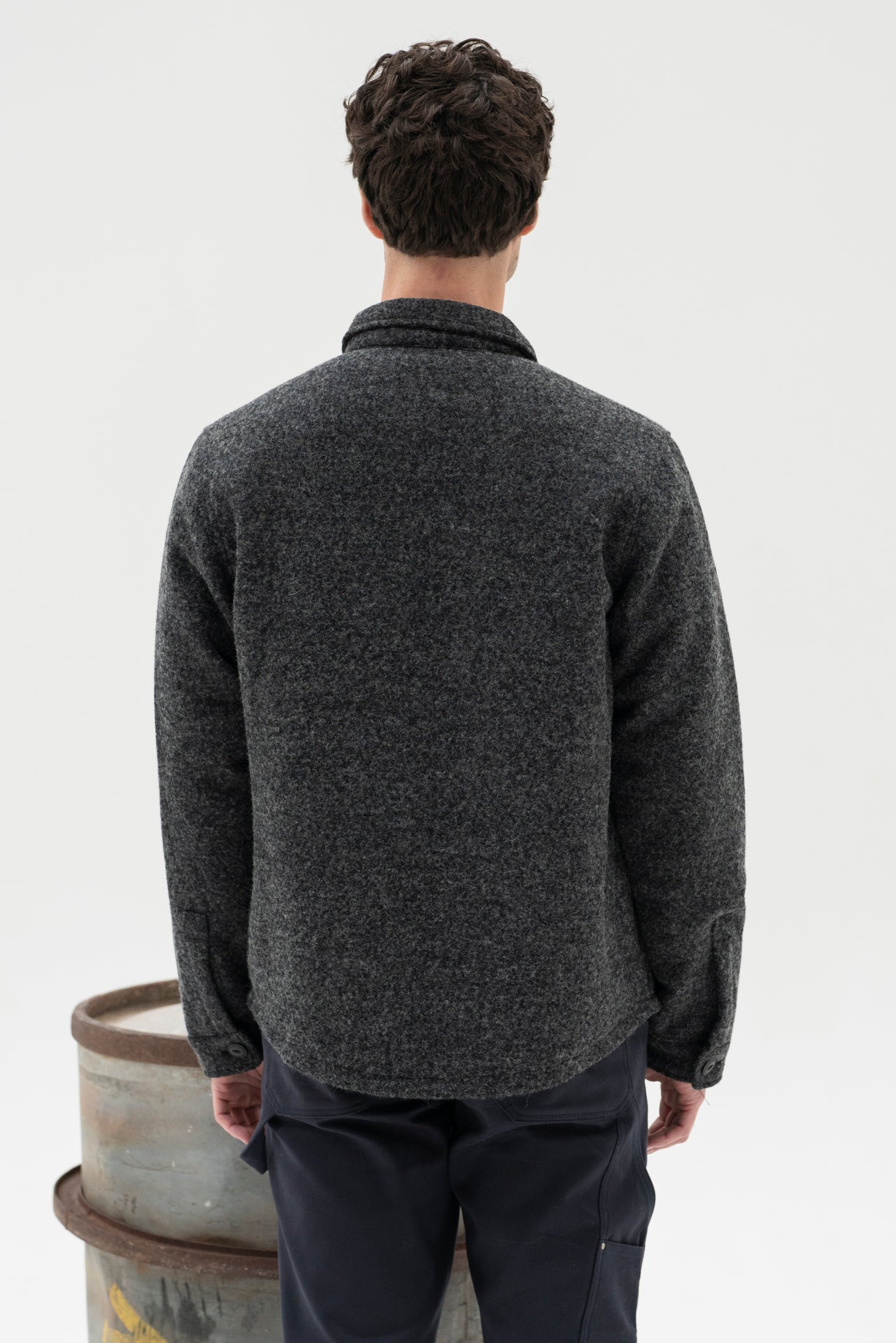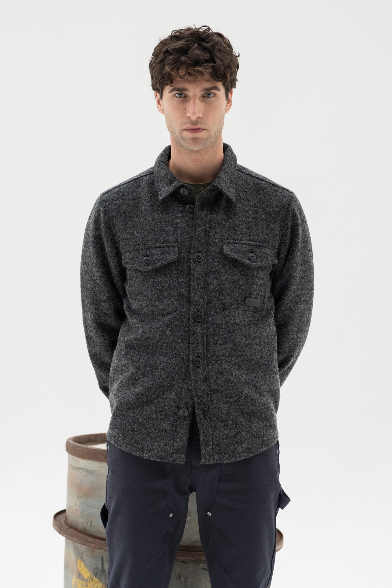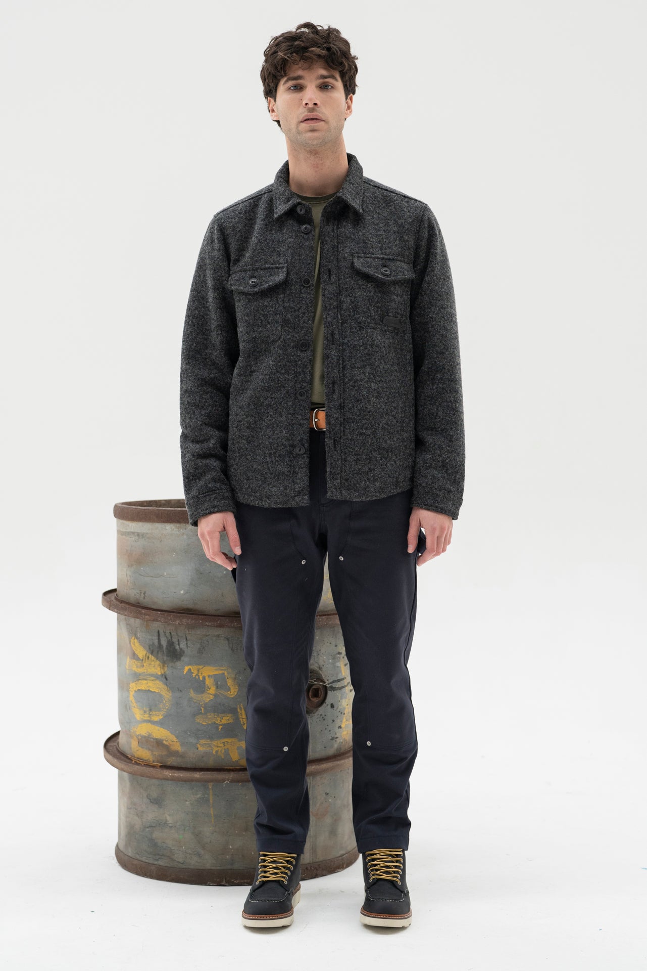 Cloth overshirt with patch chest pockets with flap and button. Contrasting color internal quilting.