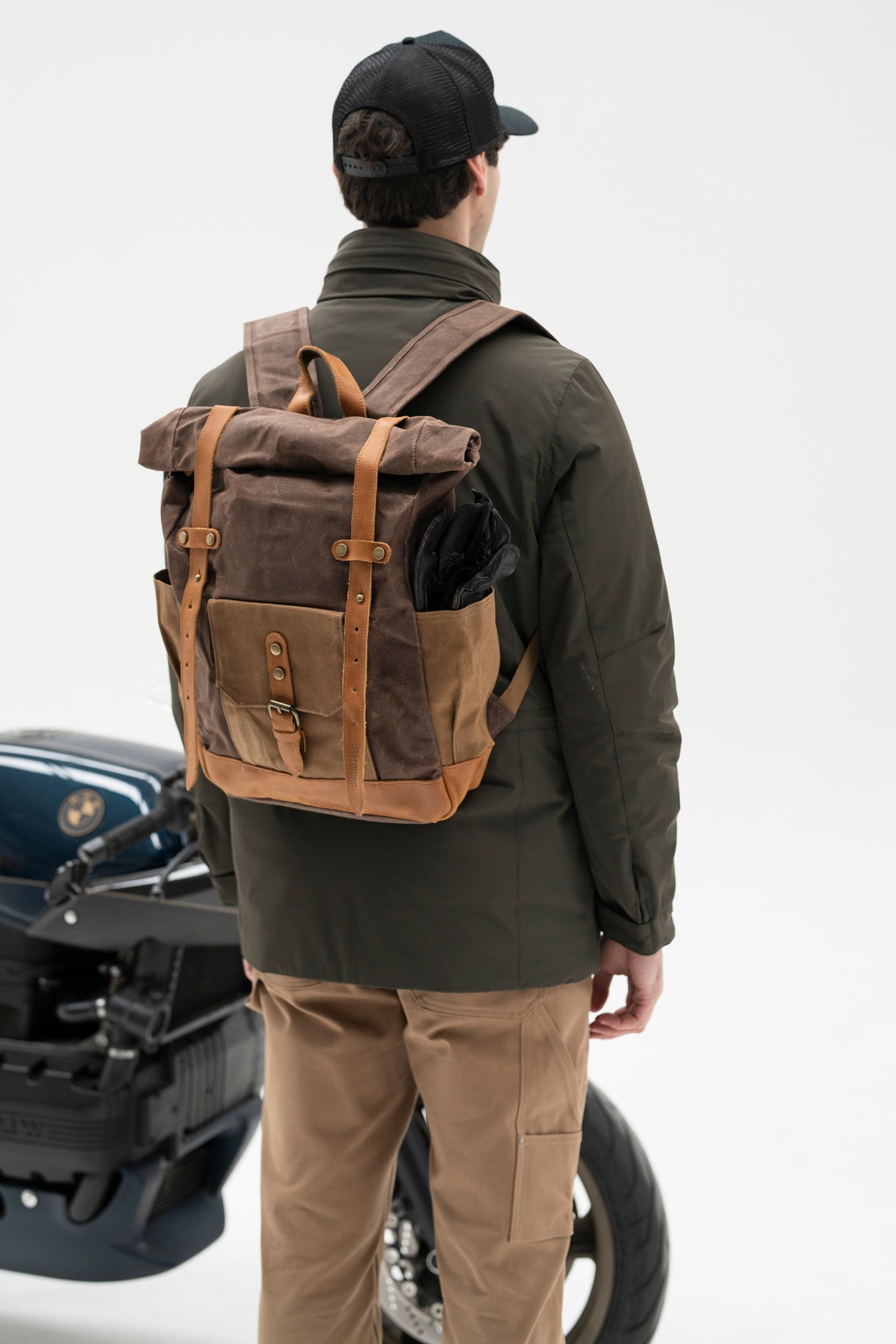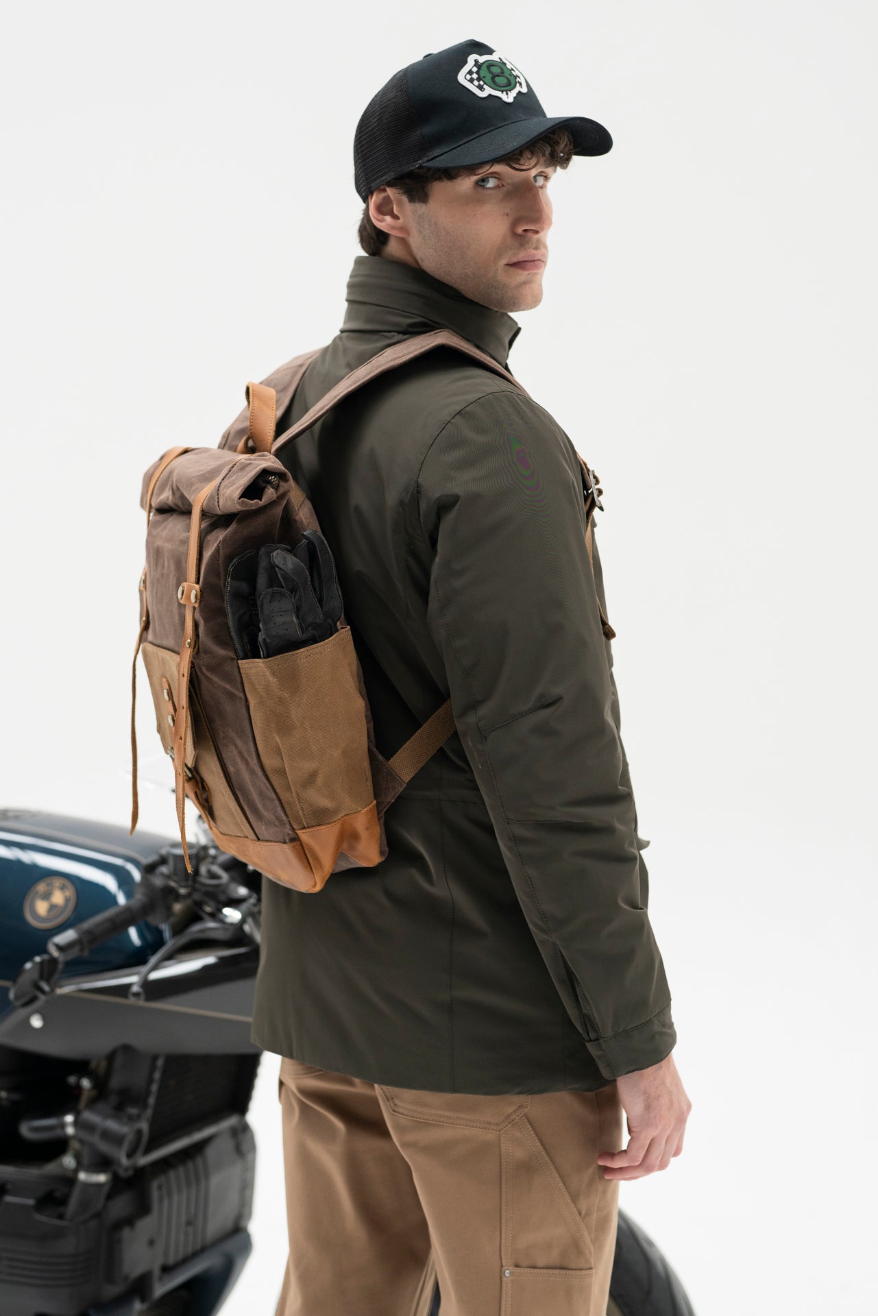 Zaino rolltop in canvas spalmato con dettagli in pelle e logo Ottodrom inciso: design funzionale e resistente, ideale per l'uso quotidiano e i tuoi spostamenti. Un mix perfetto di stile e praticità.