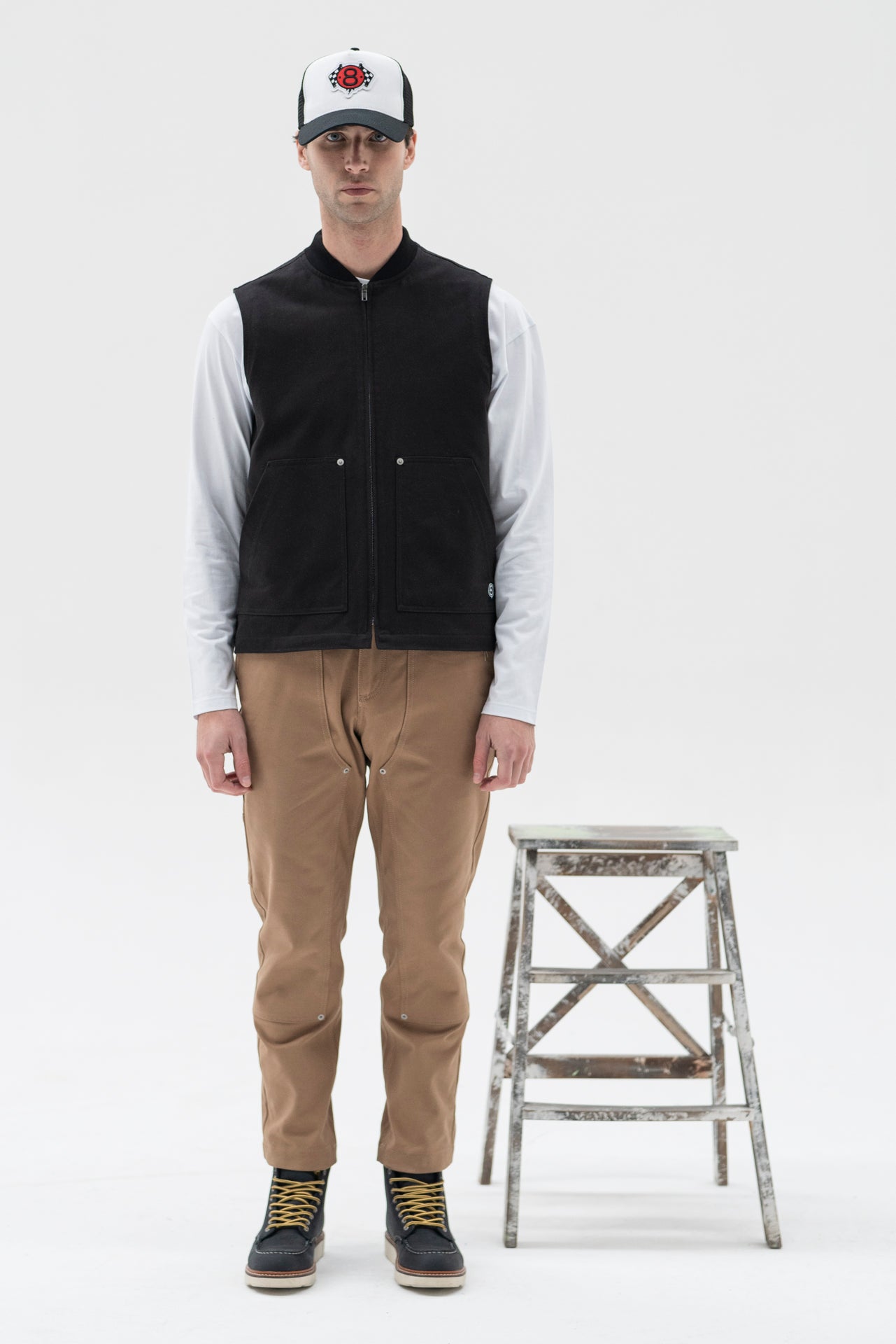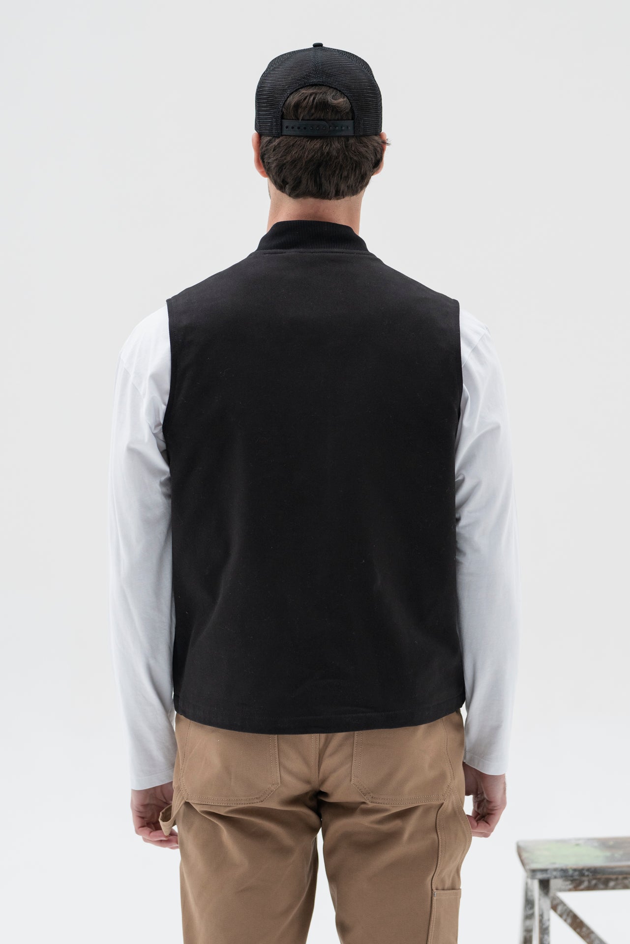 Gilet in drill di cotone con tasca corpo marsupio, collo in velluto e fodera interna in panno.