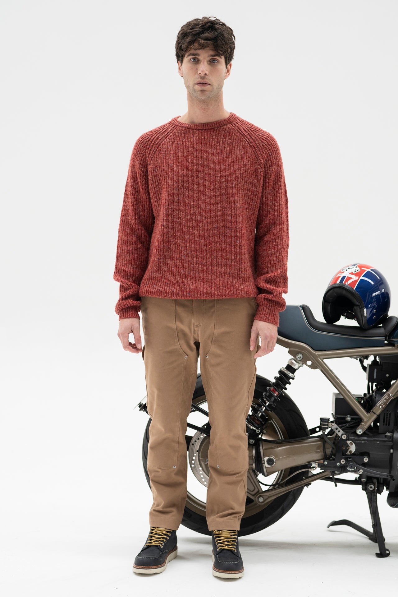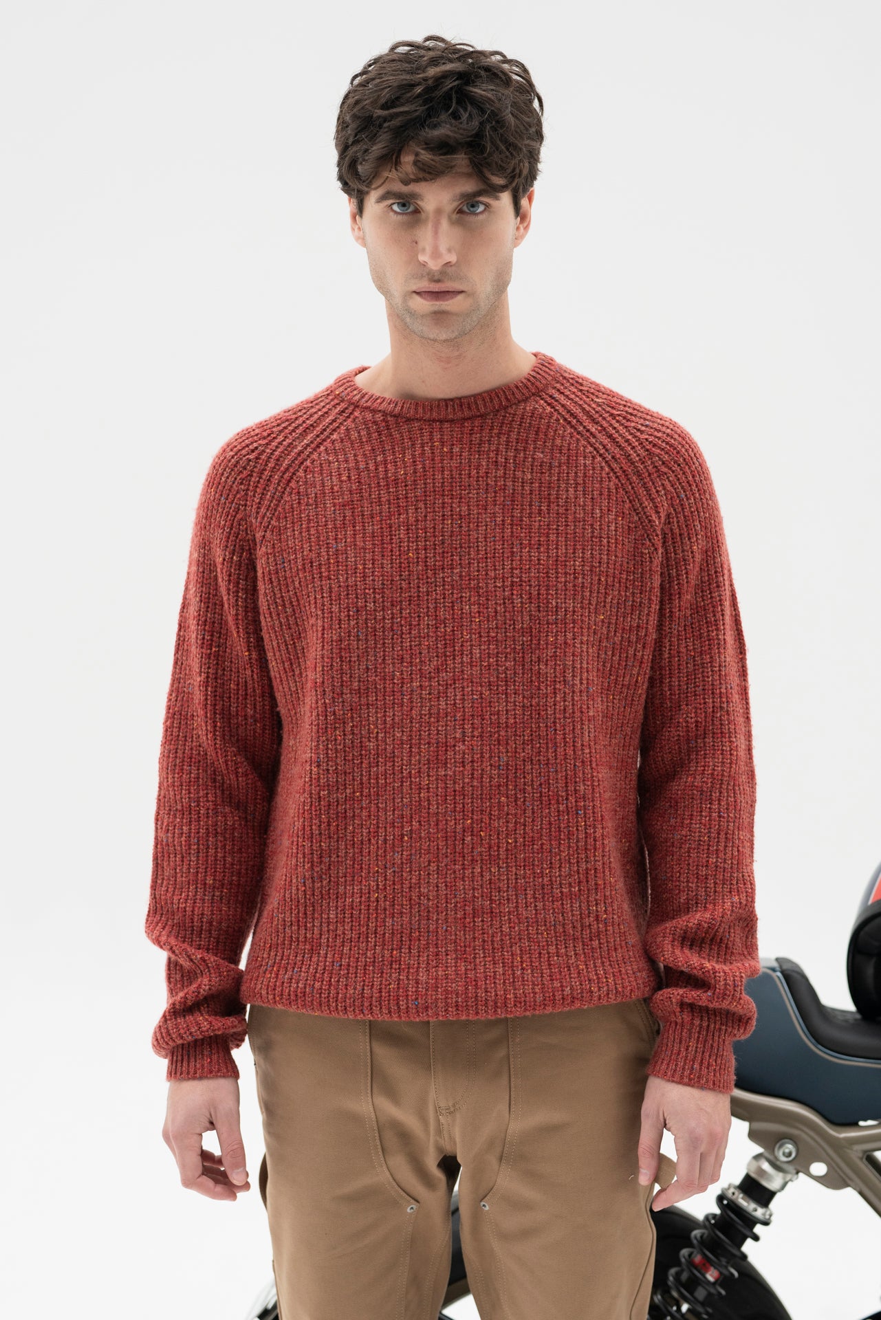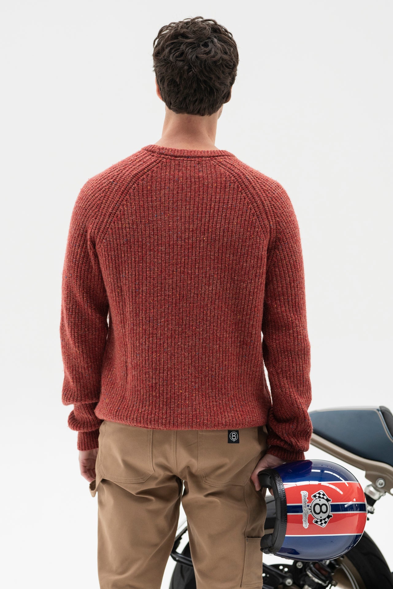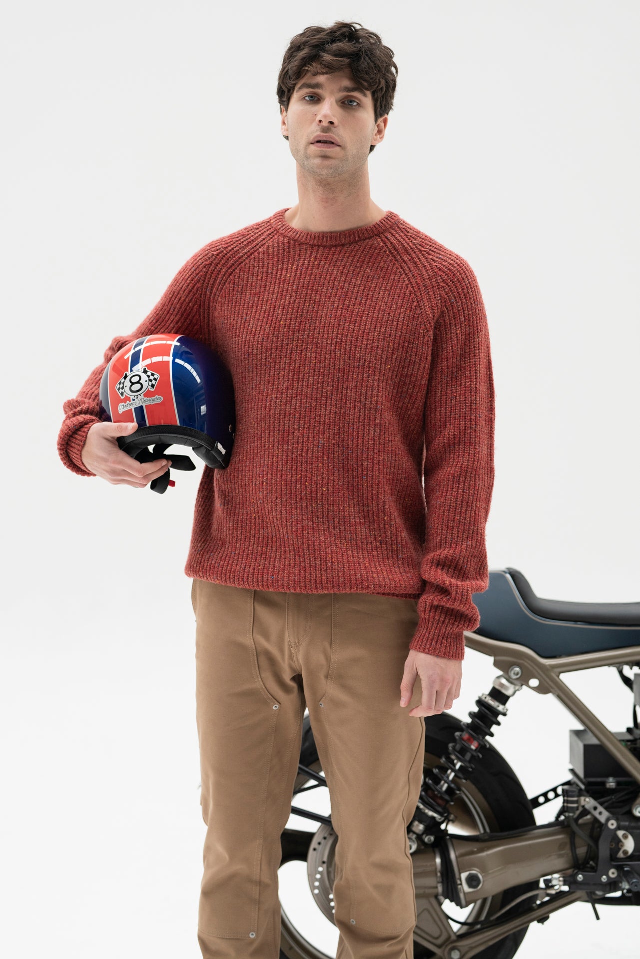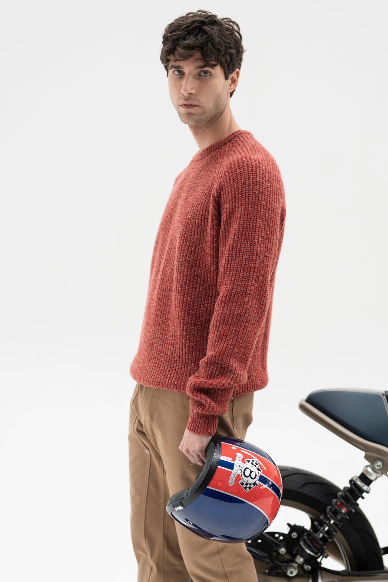 Maglia girocollo costa inglese, manica raglan. Tessuto misto lana bottonato.