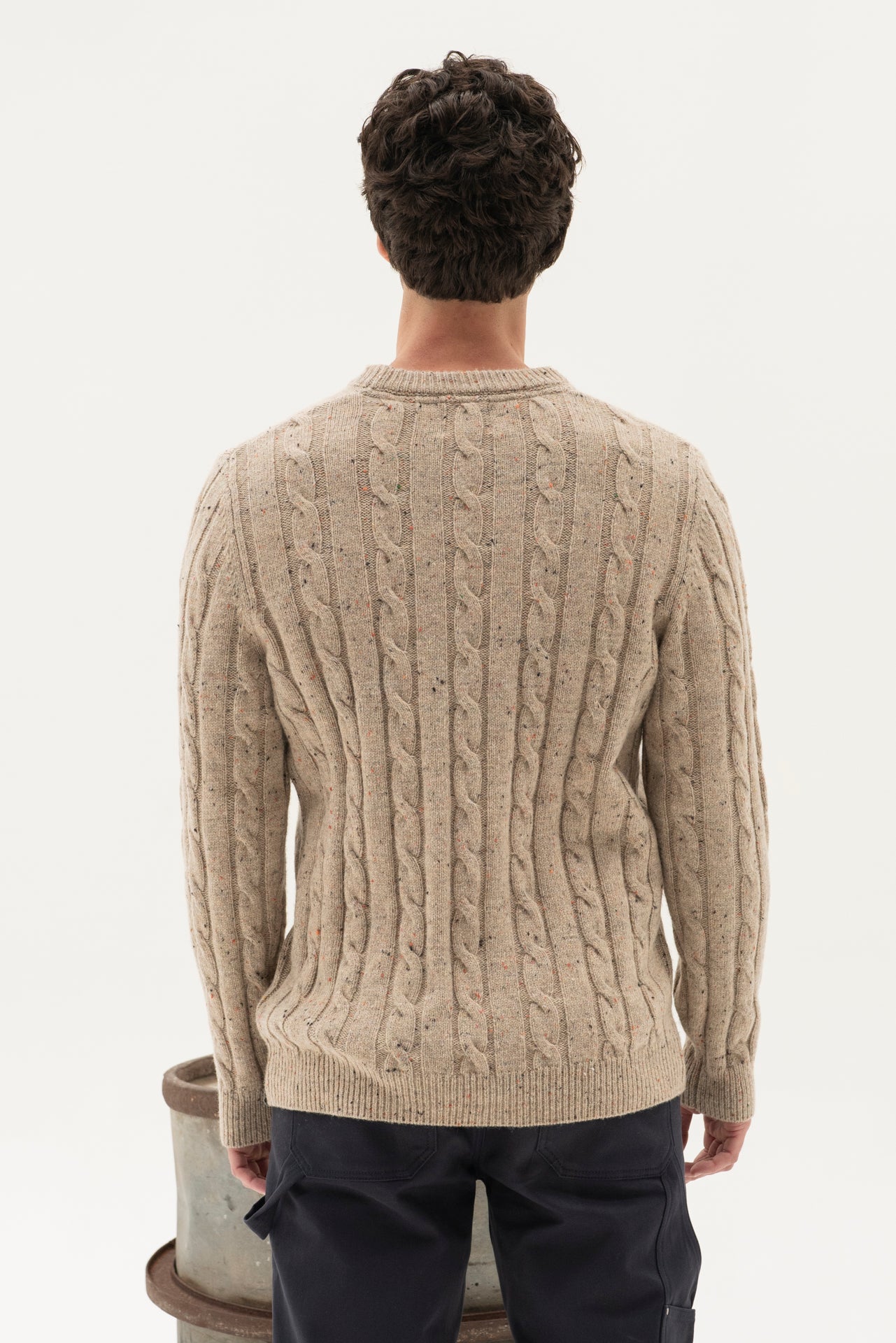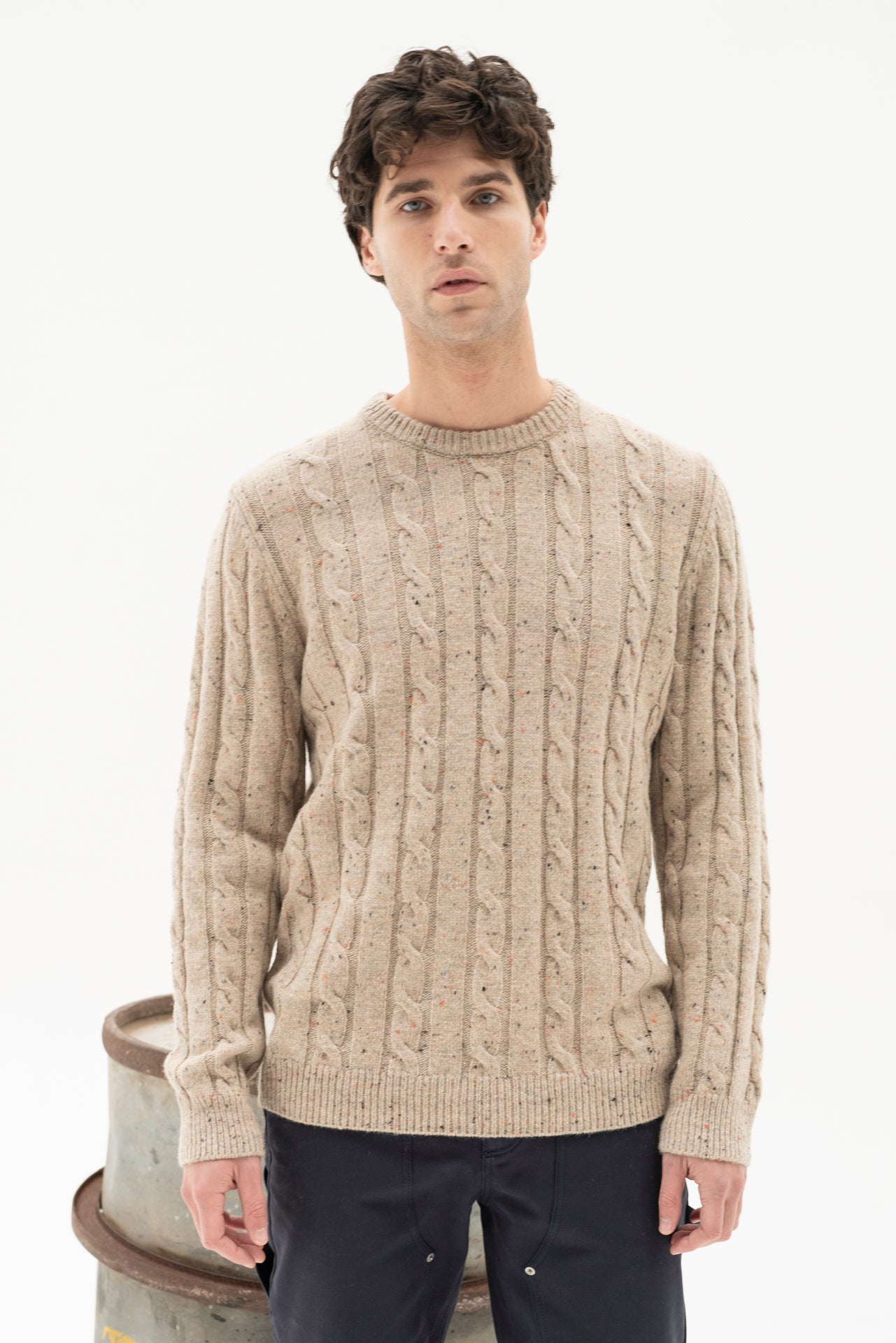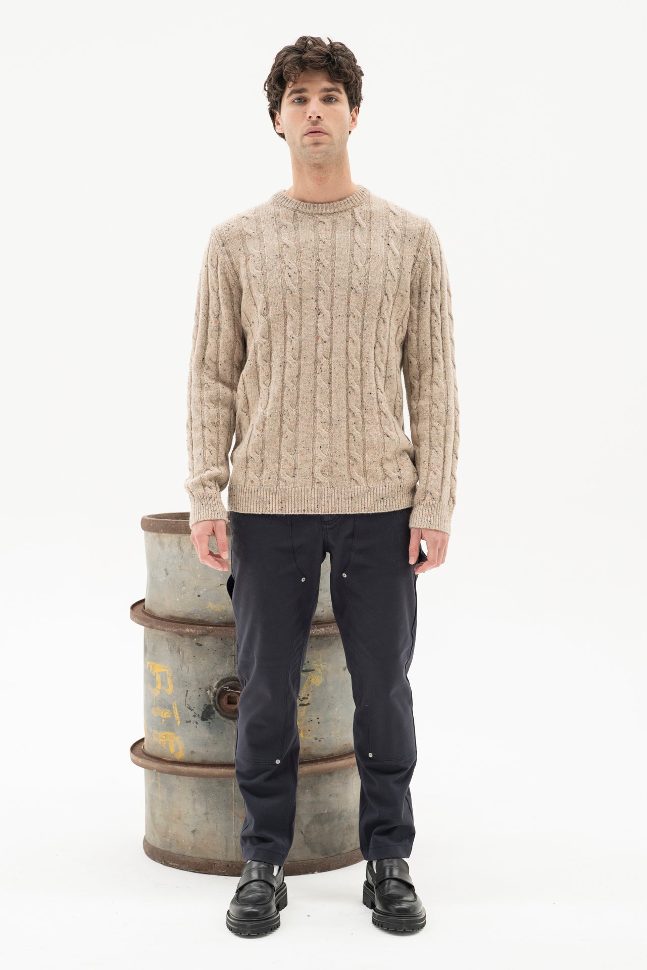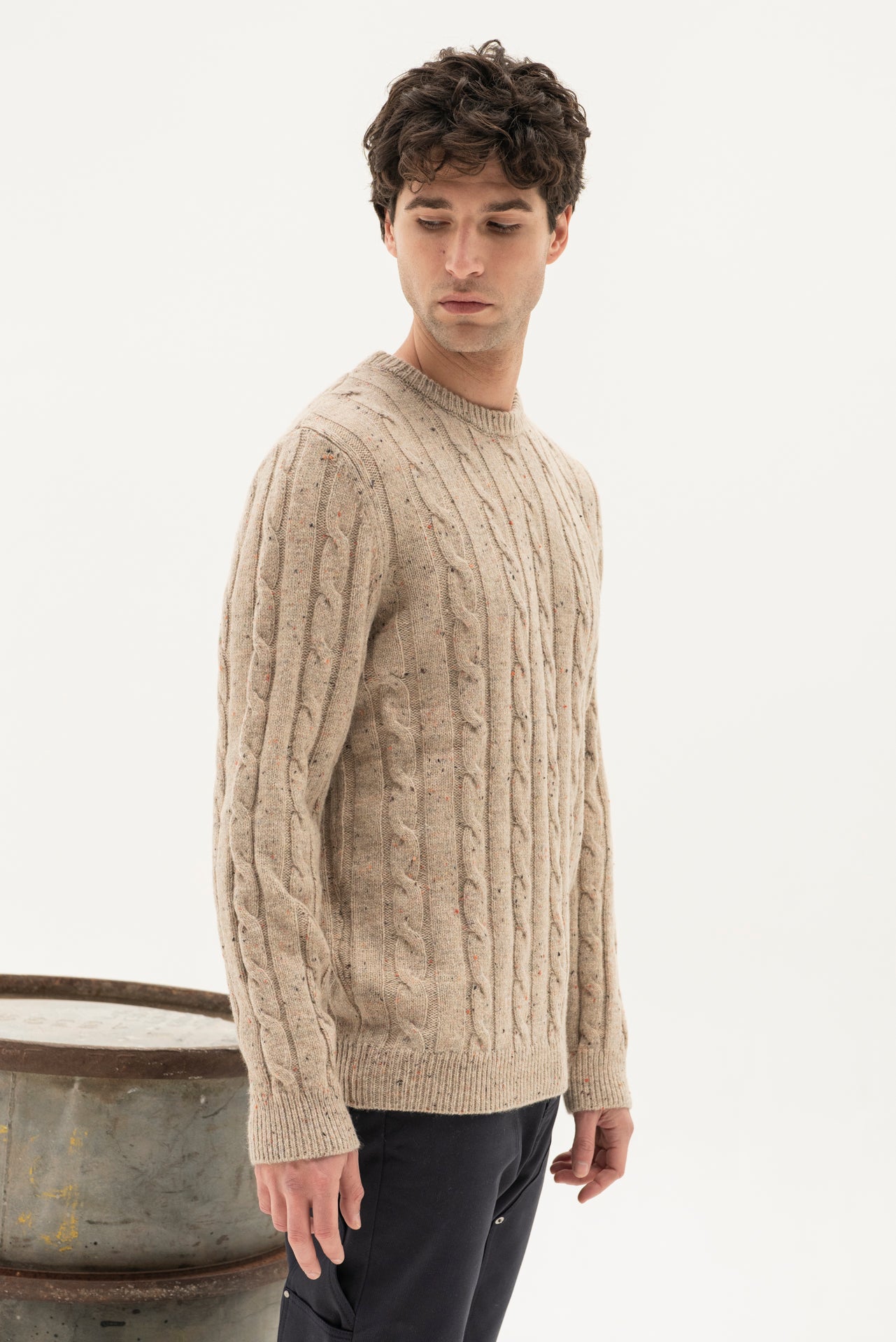 Maglia girocollo con motivo a trecce. Tessuto misto lana bottonato.
